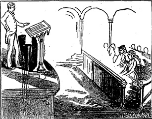 An 1883 article in Scientific American narrated how a New Jersey clergyman’s deaf wife was finally able to hear her husband’s sermons in church with the aid of an apparatus. As illustrated in the engraving, the apparatus connected a series of trumpets underneath the church floor, connecting the preacher’s desk to the pews, so that the wife was able to make use of a flexible tube to increase her hearing amplification:
