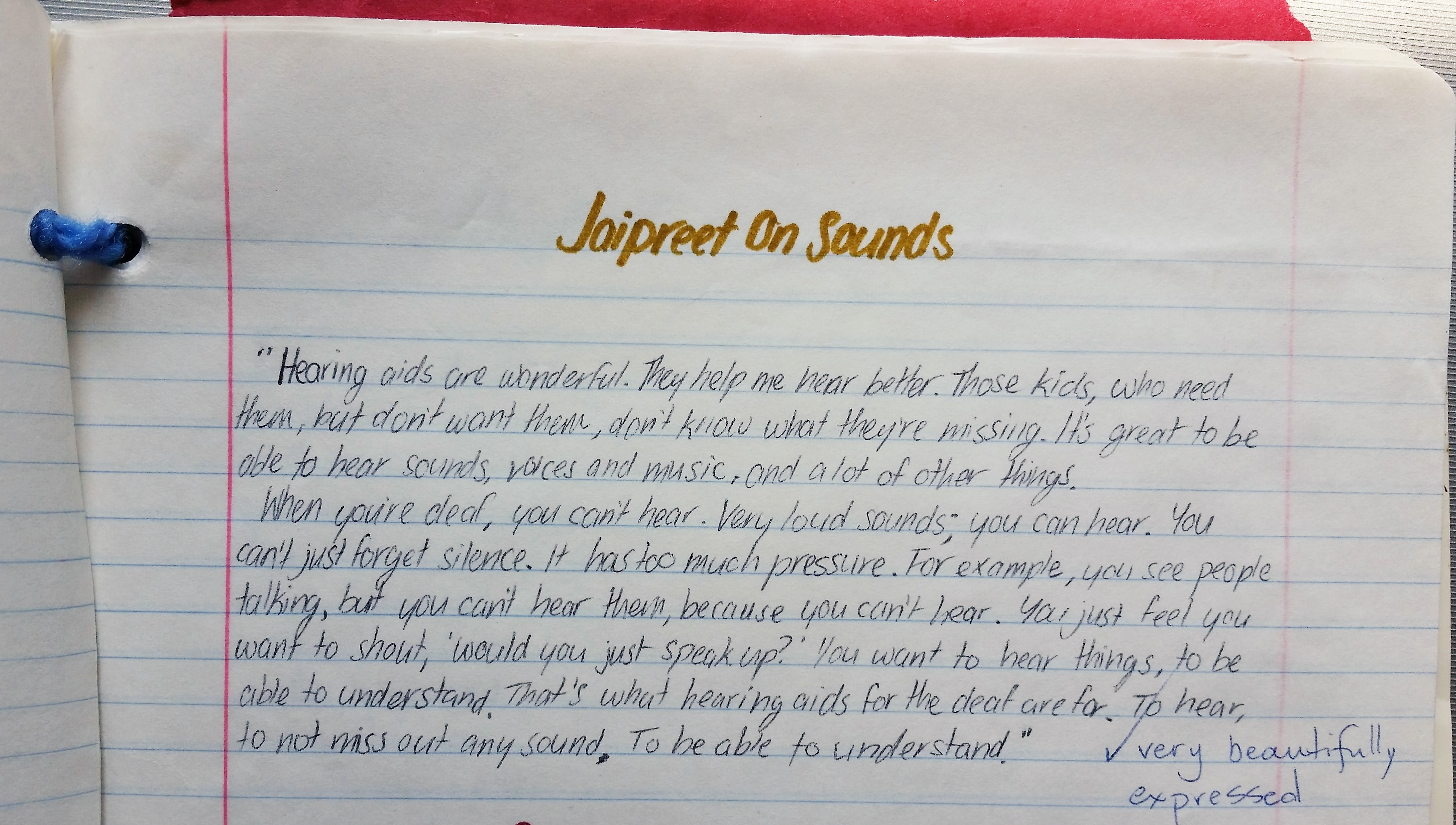 “After she was realesed [sic] from the hostipal [sic] on the first week of October, Jaipreet’s parents did everything to make her better. They took her to doctors, hoping they would have something to help her hear better. One of the doctor [sic] gave her a [sic] instrument similar to phonic ears. To Jaipreet, they didn’t work very well. She had a hard time hearing with them. When Jaipreet and her family moved to Canada, in 1988, Jaipreet got new hearing aids. For [sic] not being able to hear any sound for a long time, at last there was something that made hear hear all the wonderful sounds around her.”